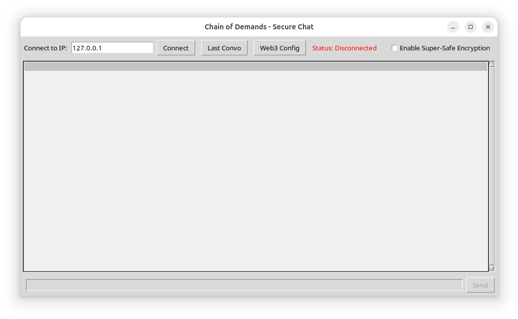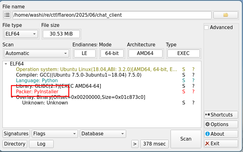 The program is a Linux ELF binary, taking the shape of a chat client.