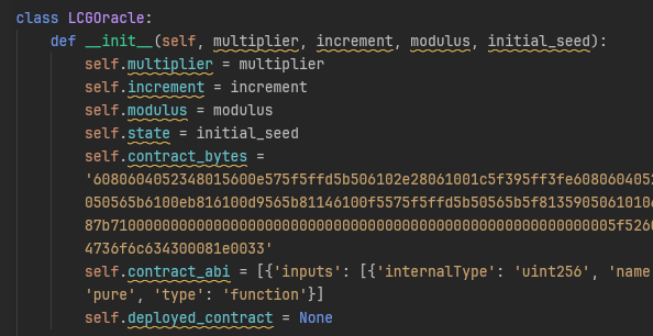 Two of these classes, LCGOracle and TripleXOROracle, are extra interesting, because they seem to be deploying some hardcoded EVM bytecode onto a ethereum-based blockchain.