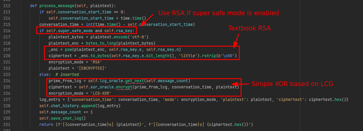 Luckily, there is a function conveniently called generate_rsa_key_from_lcg, which generates the primes using an LCG with the same initial parameters as the non-super safe mode XOR cipher uses.