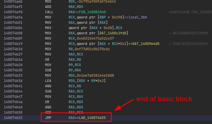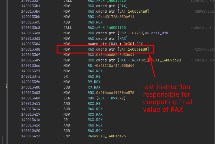 If we look in the listing of the main function, we can see at the very “end” a JMP RAX instruction: