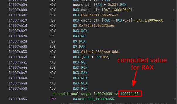 Now that we have the start of the expression, we can emulate it to infer the branch target. We can use Ghidra’s built-in emulator for this: