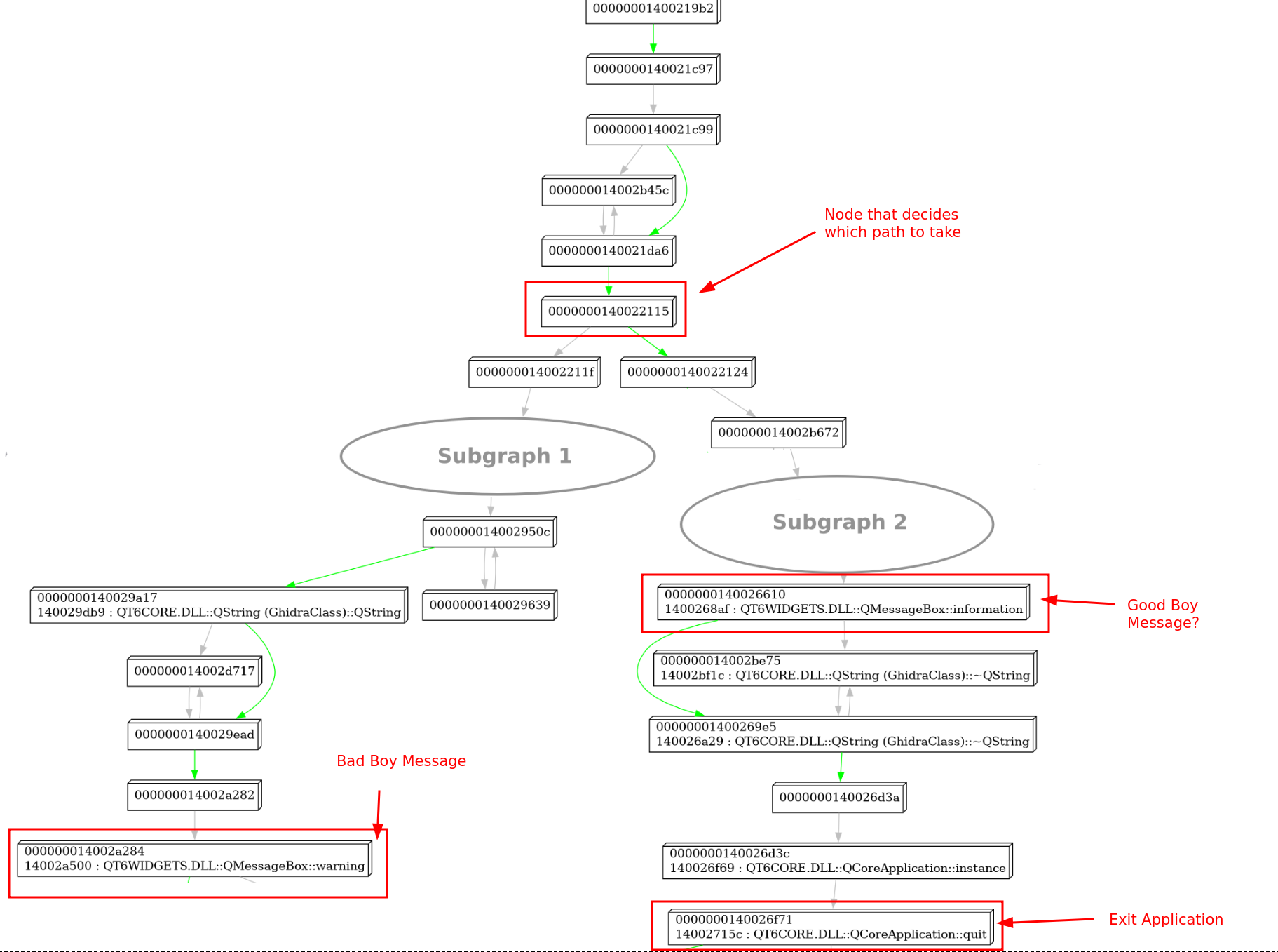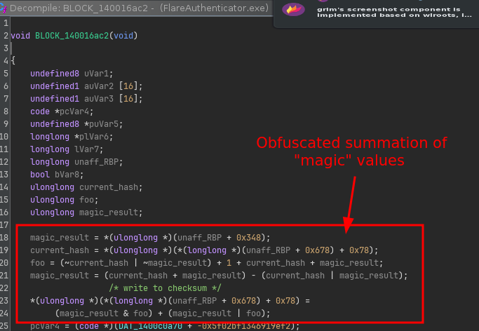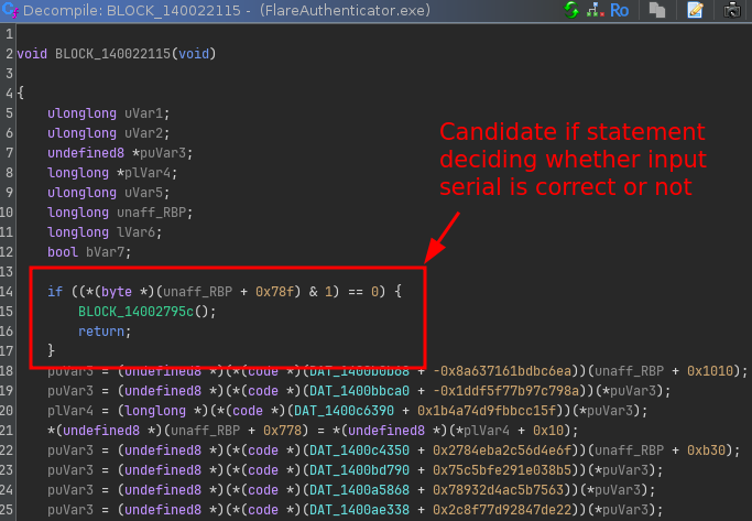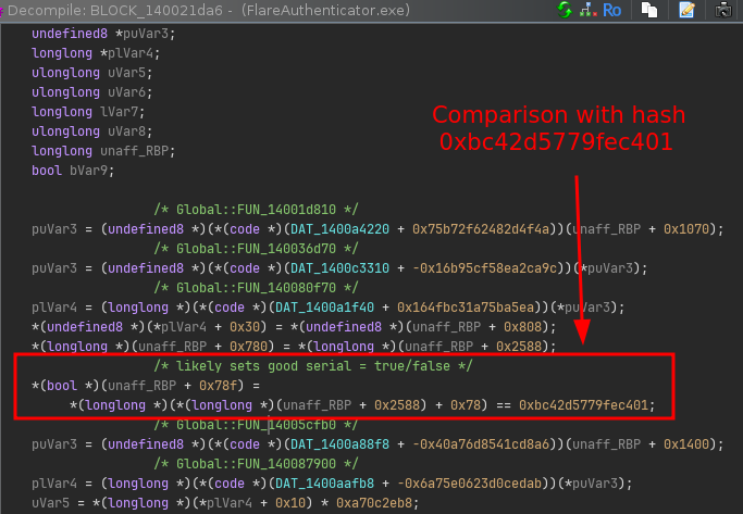 If we go up further in the CFG, we can see that the block before the if statement sets this flag by performing a comparison of what looks like some computed value with a hardcoded checksum value: