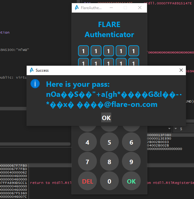 If we type in some random pass code and flip the branch temporarily in x64dbg, we can confirm that this is indeed the if statement that we are after (even though the flag is completely garbled):