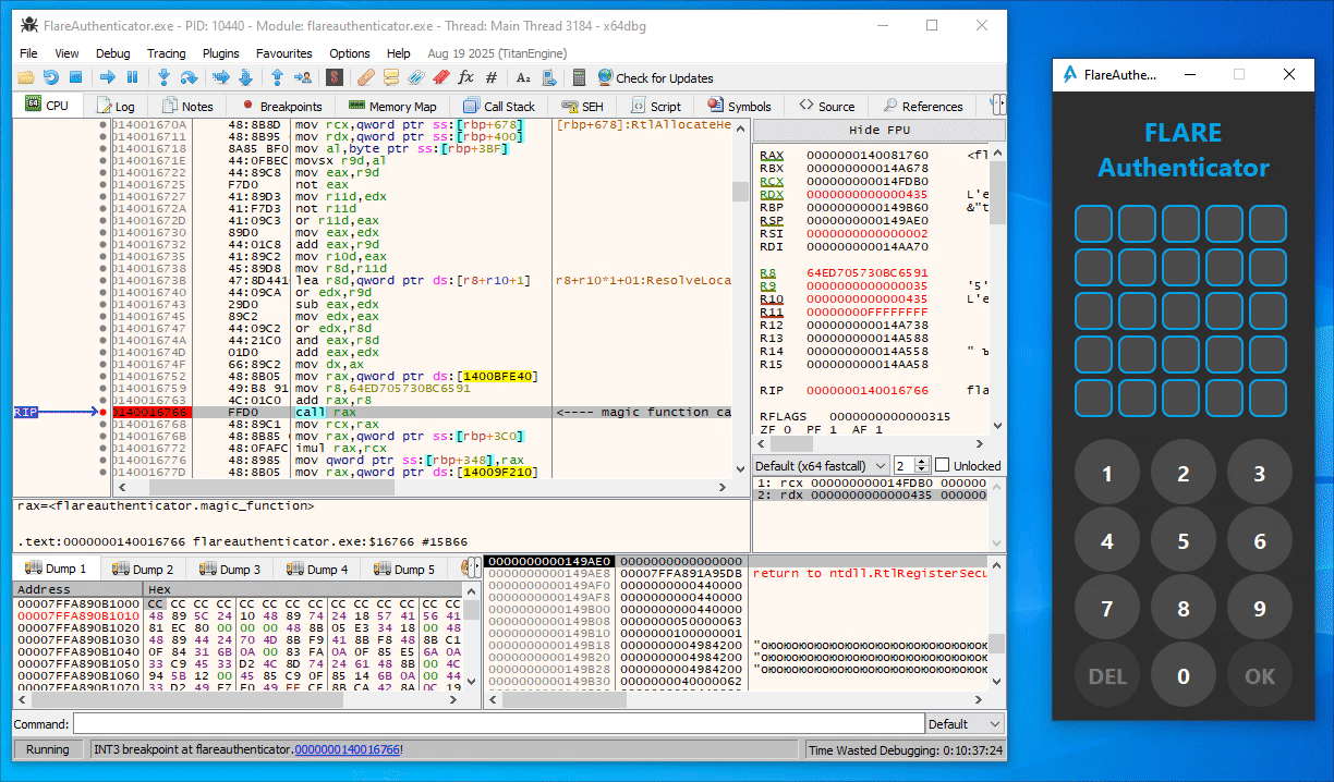 From some trial and error in x64dbg, you can easily figure out that the first call to magic_function (at 0x140015E99) in the button press handler function is simply a call with the current digit index (starting at 1) as argument (Note the last 16 bits of the second argument / RDX as displayed in x64dbg):