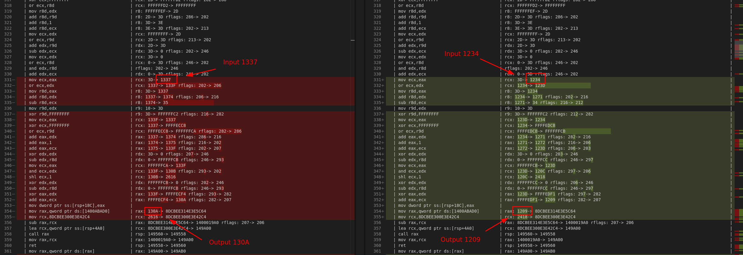 For instance, here is a chunk of code of two traces with input 0x1337 (left) and 0x1234 (right) that had the same instructions executed but different input/output values: